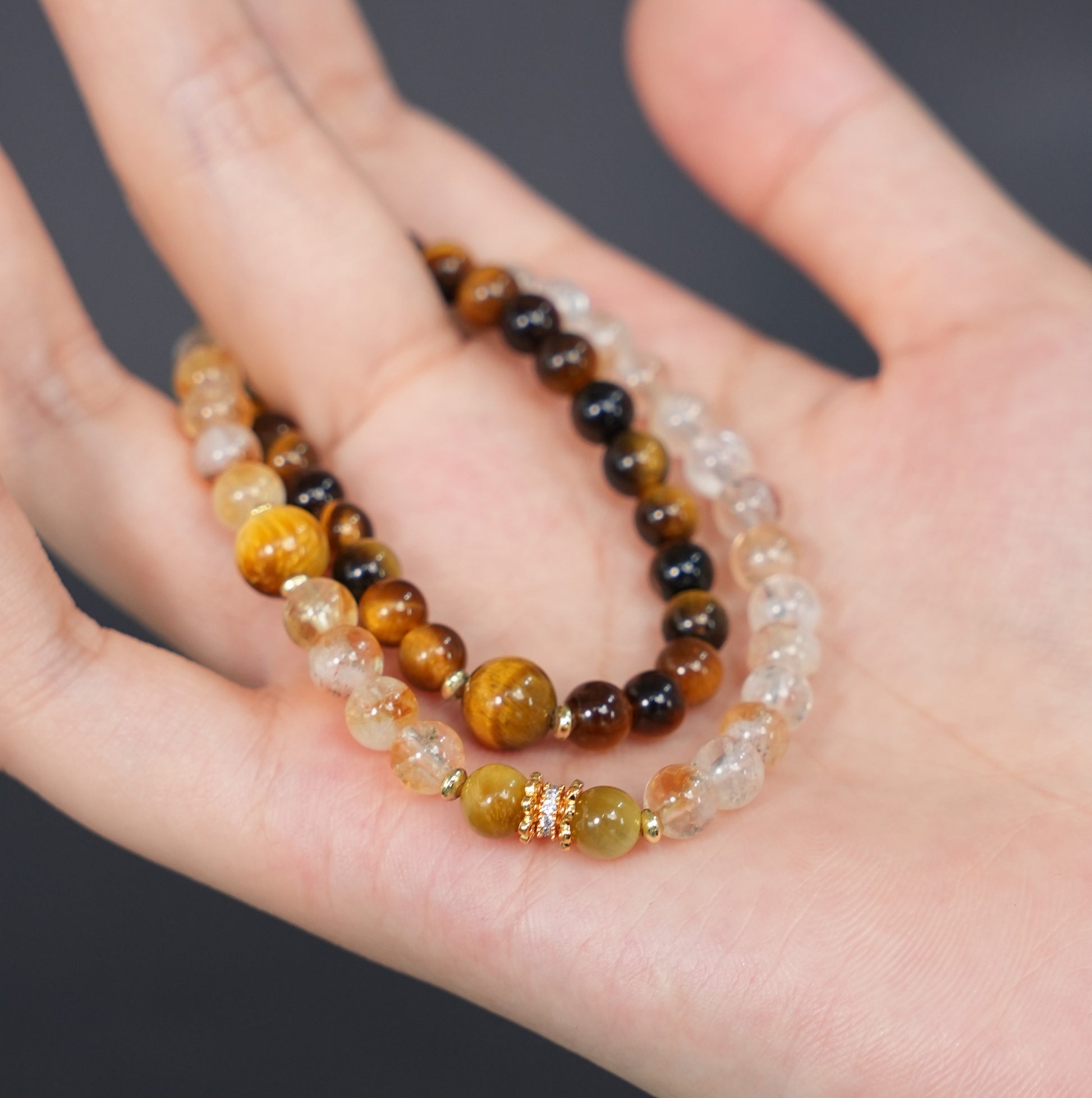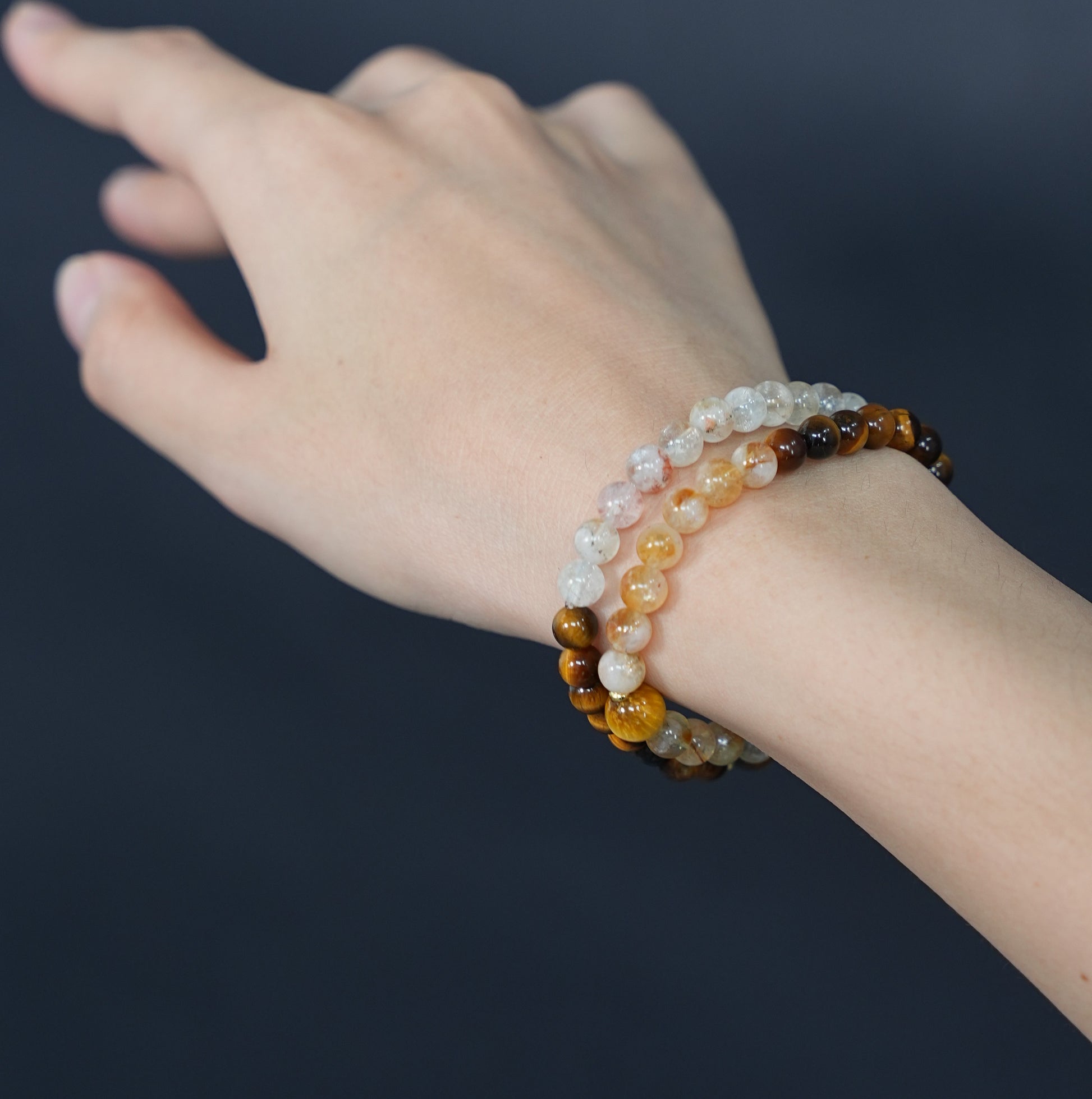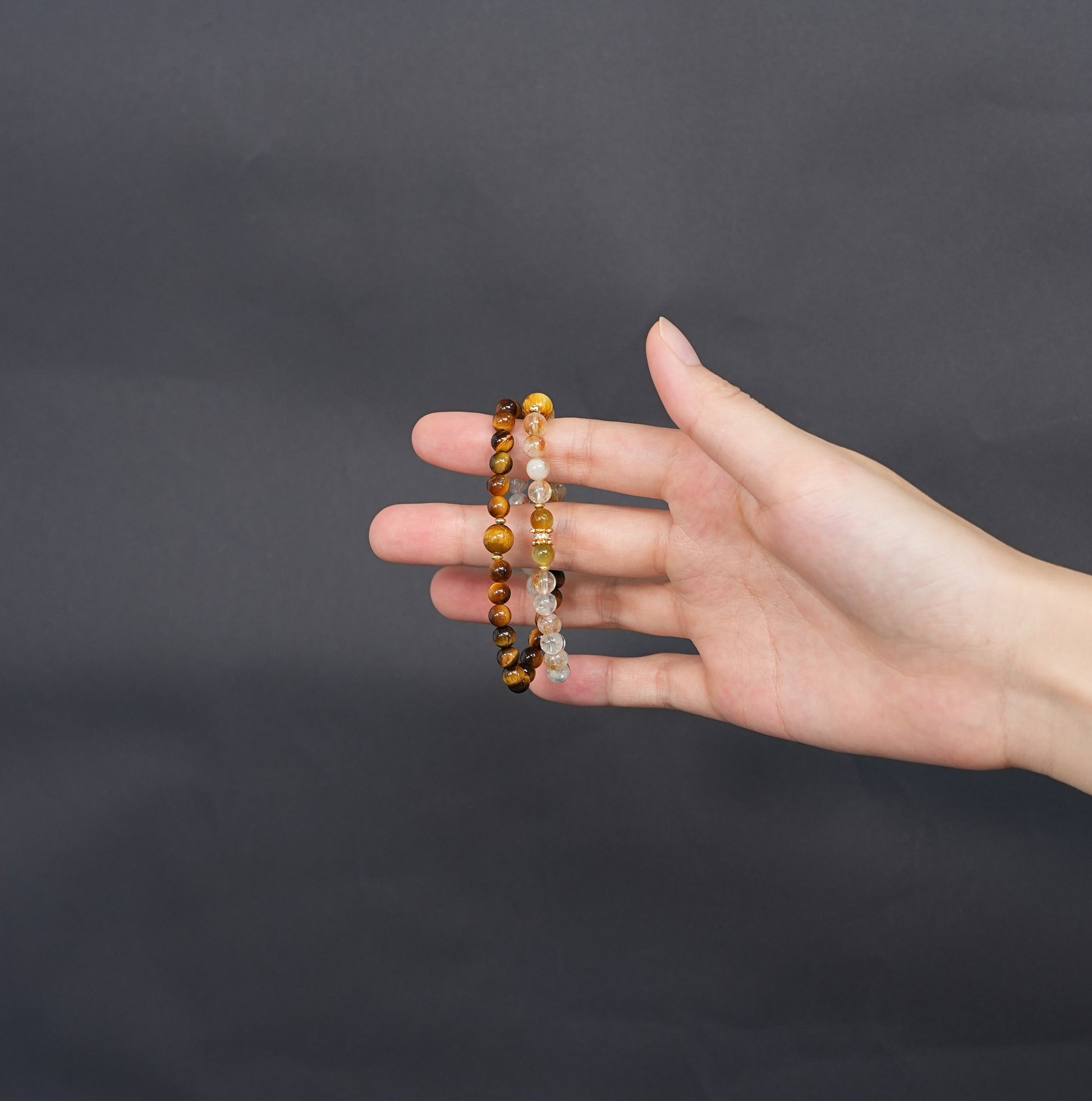 This bracelet features Tiger Eye and Rutilated Quartz, a dynamic duo for courage, focus, and success. Tiger Eye activates the Solar Plexus Chakra, boosting confidence, willpower, and decision-making. It grounds scattered energy and helps overcome fear. Rutilated Quartz amplifies personal energy, promotes clarity, and removes energetic blockages—making it ideal for those striving for goals or seeking breakthroughs. Together, they attract prosperity, sharpen intuition, and fortify determination. Recommended for Leo, Capricorn, and Aries signs, or anyone needing strength, focus, and forward momentum.