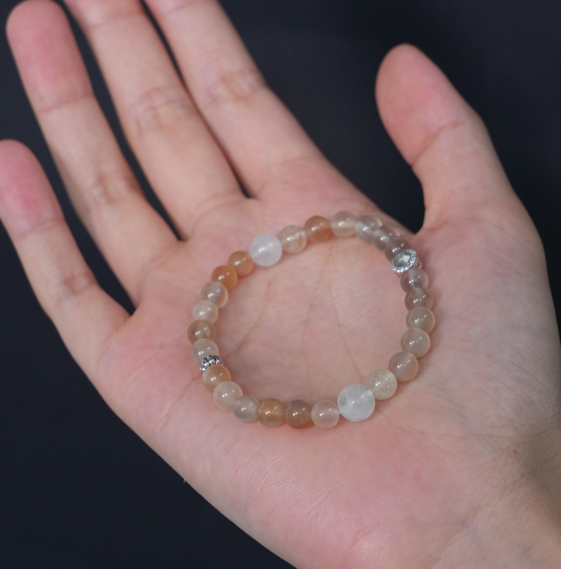This bracelet features a harmonious blend of White, Grey, and Orange Moonstone—ideal for those seeking emotional balance, feminine energy, and inner alignment. White Moonstone soothes the heart and nurtures intuition, Grey Moonstone grounds emotions and deepens inner awareness, while Orange Moonstone brings joy, optimism, and creative flow. Together, they calm emotional waves, awaken divine feminine energy, and support spiritual insight. Recommended for Cancer, Pisces, and Libra signs, or anyone wishing to embrace emotional healing, intuitive clarity, and graceful transformation.