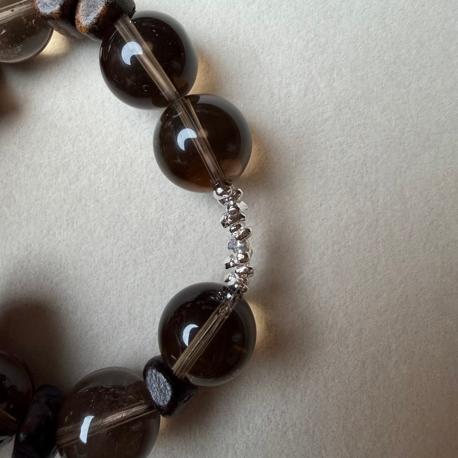 Materials: Smoky Quartz, Clear Quartz, Natural Wood, Silver-tone Accents