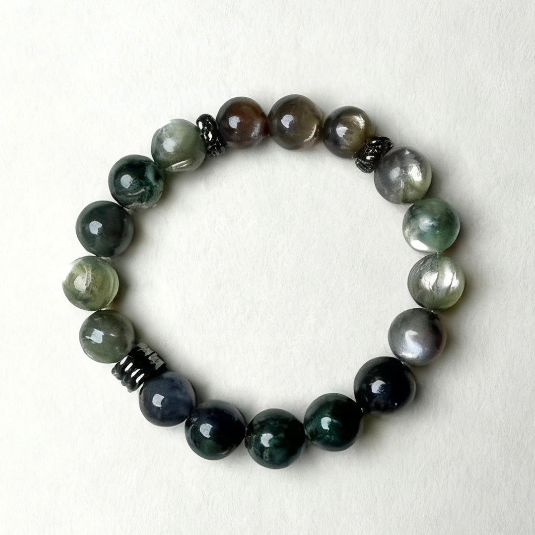 This bracelet blends the grounding power of Obsidian with the stabilizing calm of Green Lepidolite. Green Lepidolite, rich in lithium and iron, balances emotional swings while promoting rational thought and resilience. It restores harmony between heart and mind, fostering emotional intelligence and composure. Obsidian offers deep grounding and energetic protection, helping to release tension and negative attachments. Together, they create a field of calm strength, clarity, and protection—ideal for those seeking emotional balance amid challenges. Especially recommended for Capricorn, Virgo, and Scorpio signs, or anyone desiring peace, focus, and grounded confidence in daily life.