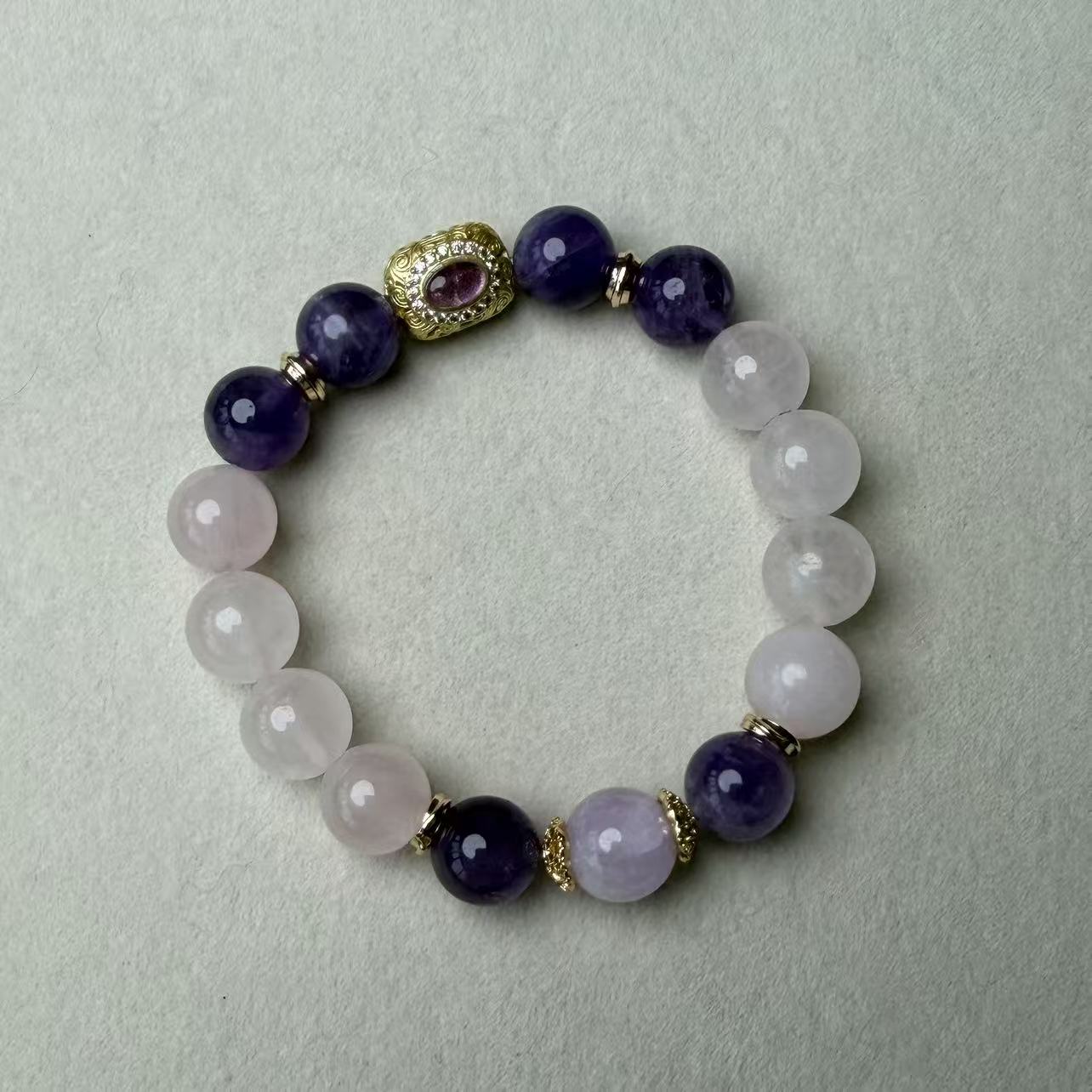 This bracelet blends the spiritual clarity of Amethyst with the soft, nurturing vibration of Milky Rose Quartz. Amethyst calms the mind, sharpens intuition, and promotes peaceful awareness, making it ideal for emotional release and spiritual grounding. Milky Rose Quartz gently supports heart healing, self-love, and emotional softening, providing a warm and comforting energy. The gold-plated centerpiece adds an elegant touch, enhancing the bracelet’s refined and feminine aesthetic. Together, these stones create a serene and loving frequency that uplifts the spirit and soothes the heart. Especially recommended for Pisces, Cancer, and Libra signs, or anyone seeking emotional peace, clarity, and gentle heart-healing energy.