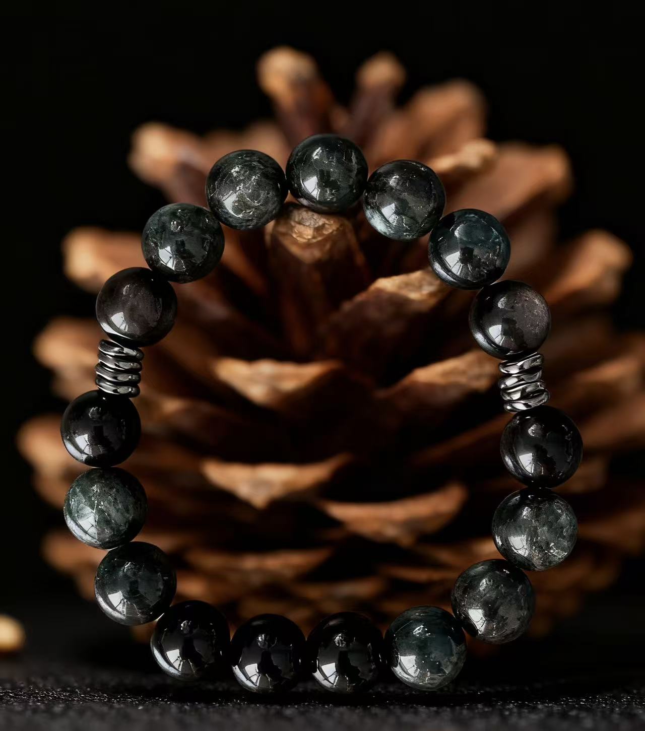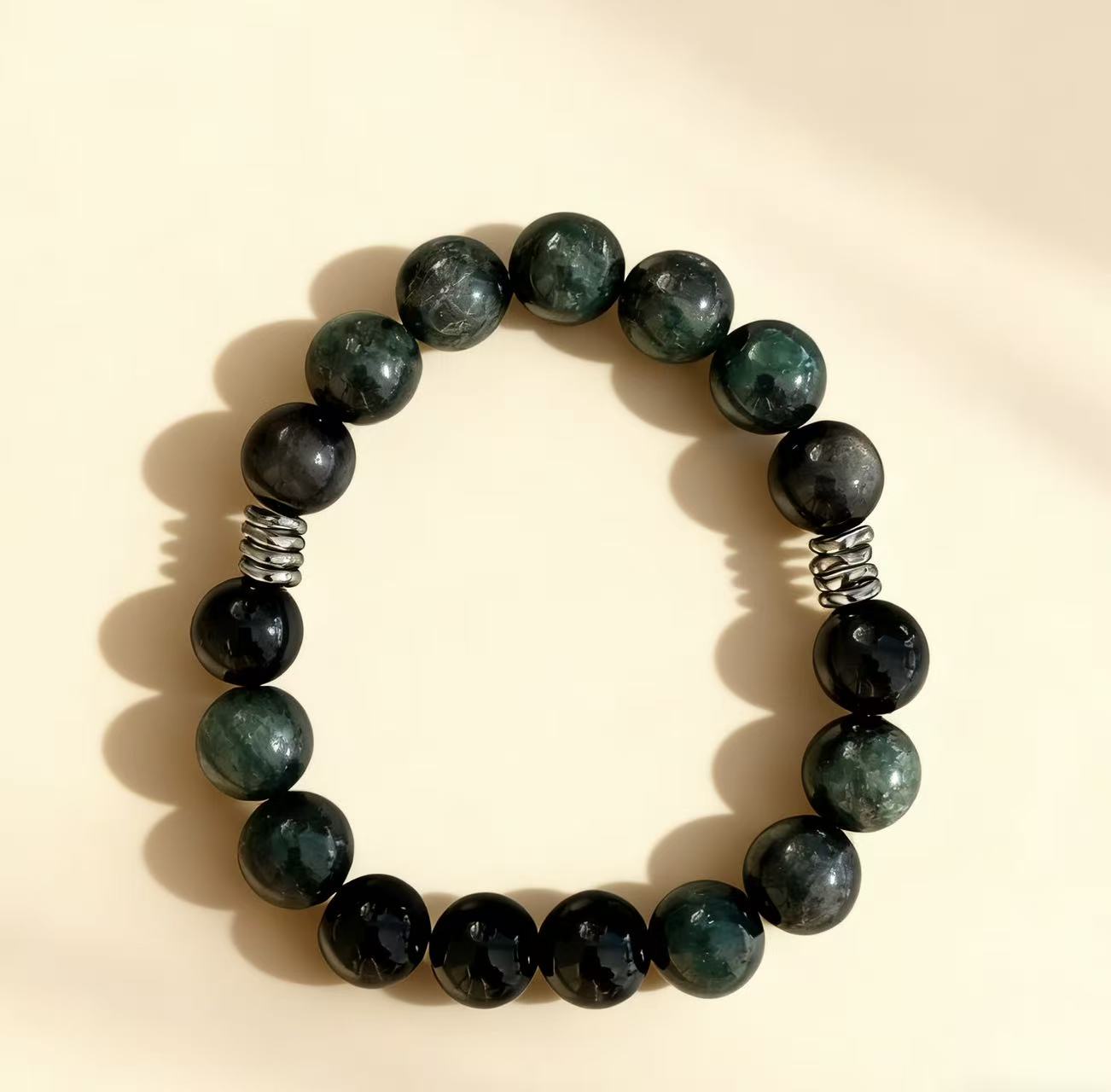 This bracelet combines Green Kyanite and Obsidian—an empowering duo for emotional balance and energetic protection. Green Kyanite harmonizes all chakras, promoting mental clarity and emotional healing while restoring natural energy flow. Obsidian, known as a powerful grounding stone, shields against negativity and absorbs unwanted energies. Together, they stabilize emotions, enhance focus, and provide deep energetic cleansing. Especially recommended for Capricorn, Scorpio, and Virgo signs, or anyone seeking inner harmony and energetic resilience in daily life.