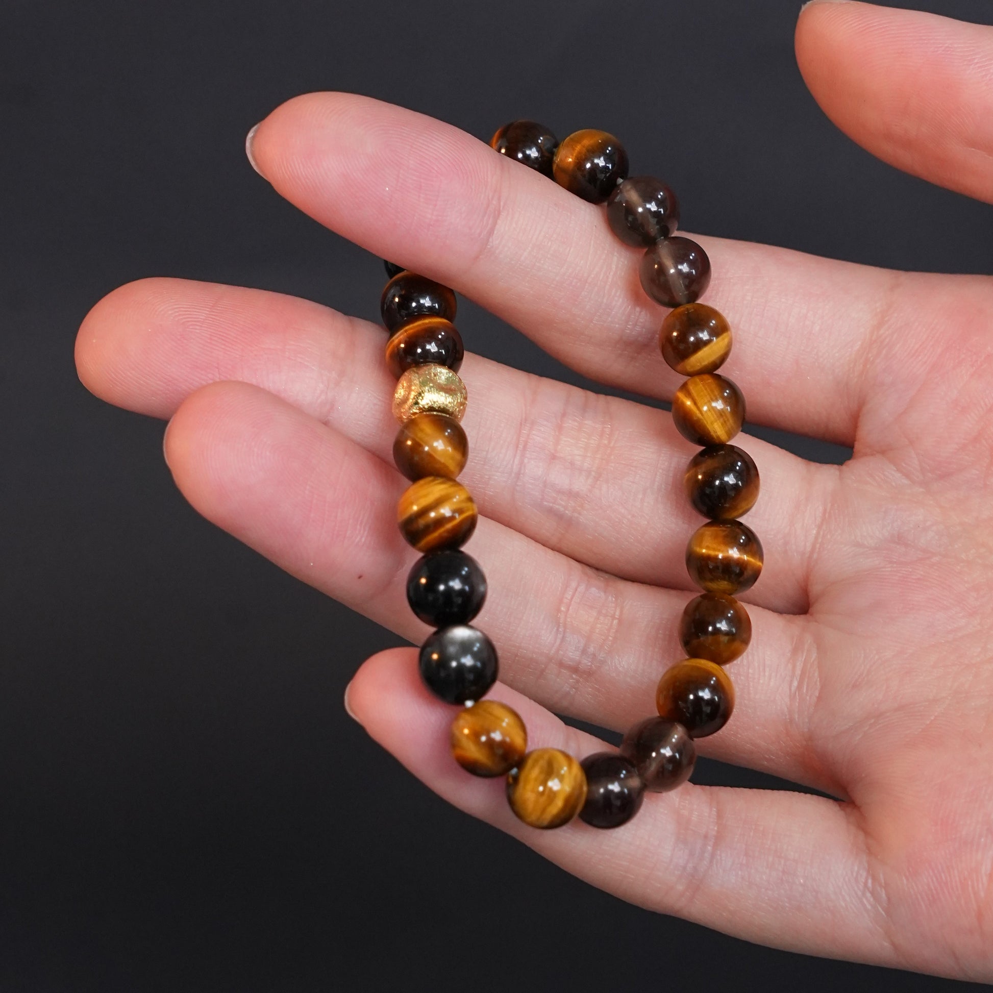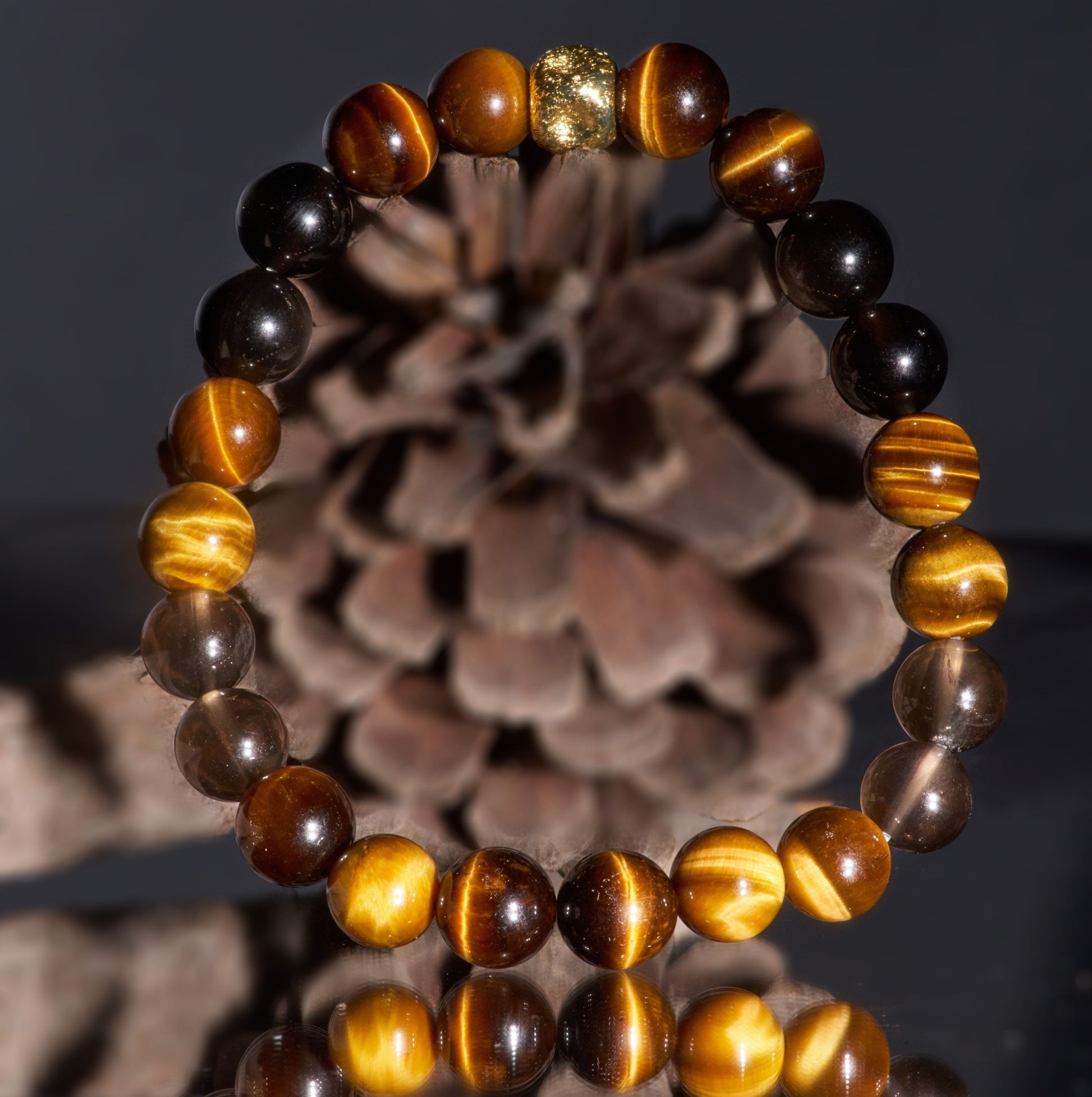 - Materials: Tiger Eye, Smoky Quartz, Obsidian
